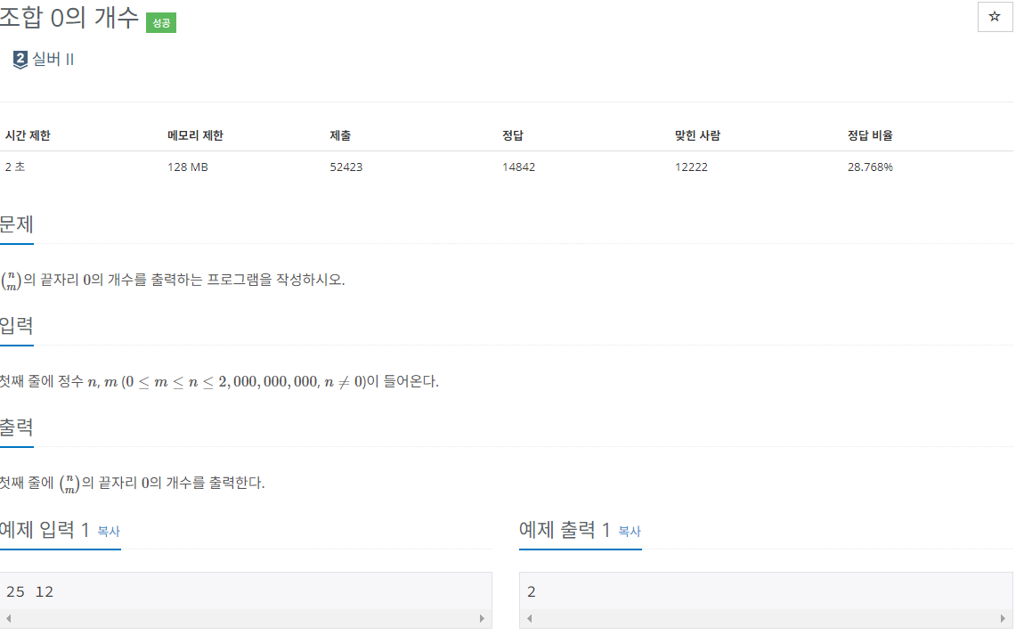 - n과 m의 조합 값에서의 0의 개수는 n!의 0의 개수 - (n-m)!의 0의 개수 - m!의 0의 개수