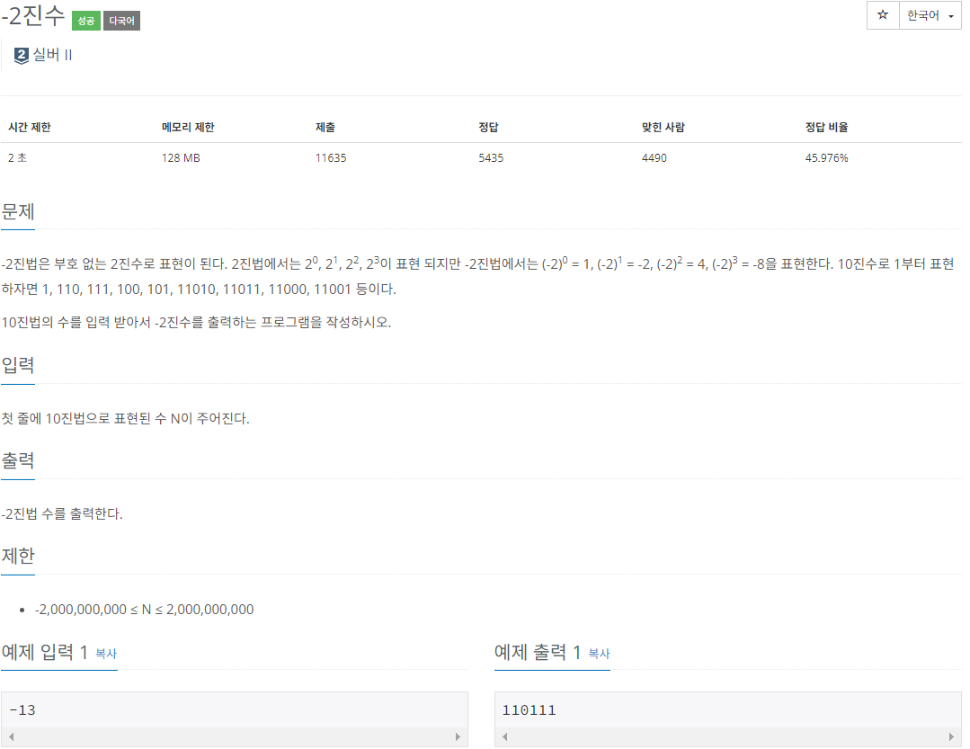 진법 변환은 나누는 수, 몫, 나머지의 관계애서 출발하므로, 이 문제도 -2를 나누는 수로 하고 나머지를 0 또는 1로 갖는 식으로 계속 나누어 주면 된다.