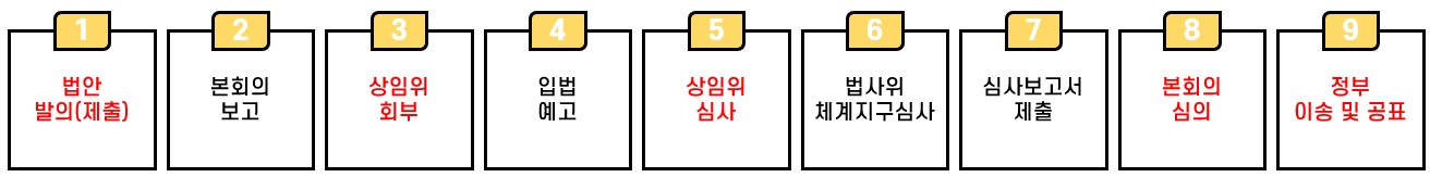현역 국회의원 10명 이상의 찬성에 의해 법률안이 발의되며, 발의된 법안은 본회의 보고 후, 소관 상임위원회(상임위)에 회부돼 심사를 받게 됩니다.